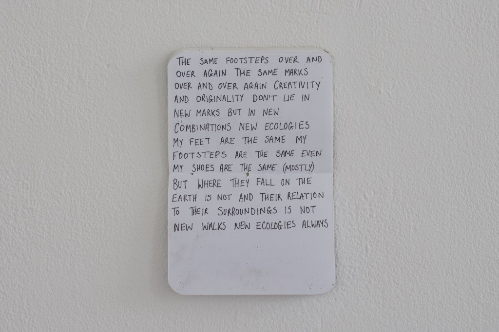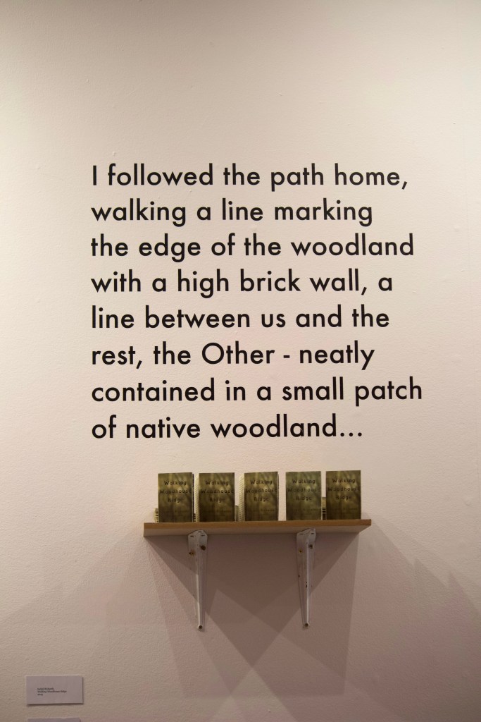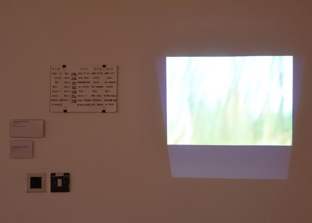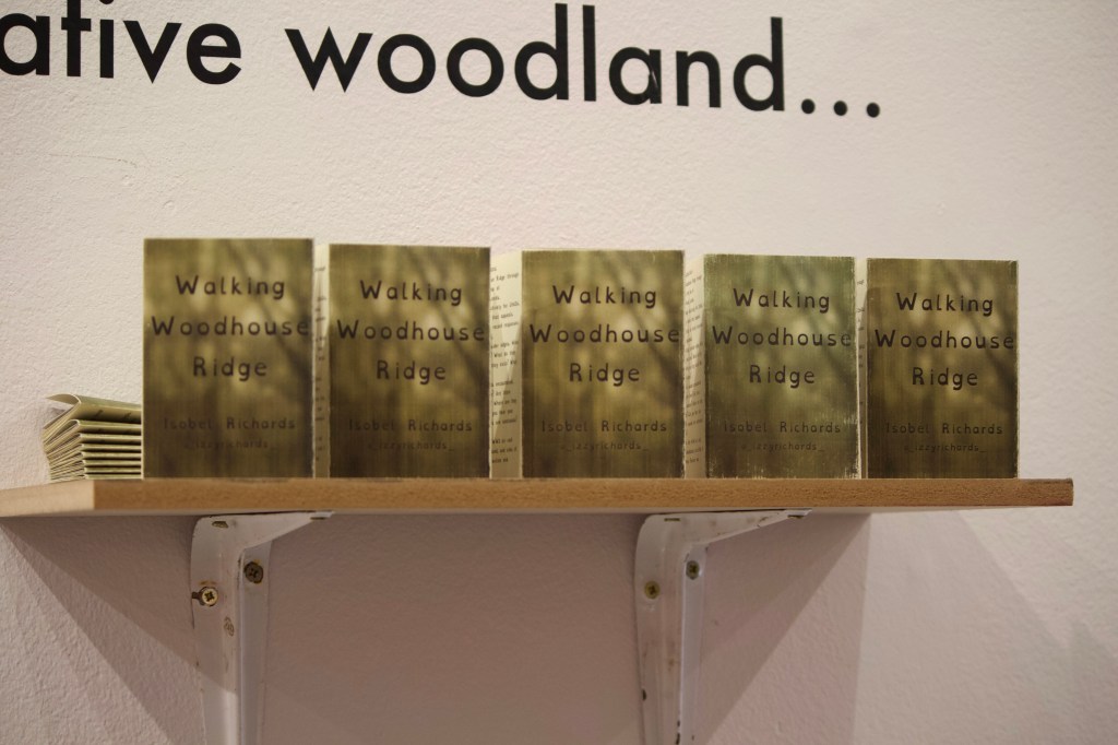 Walking Woodhouse Ridge has been exhibited twice, in both iterations of I Never Agreed to Lend My Voice, with each iteration playing with curation and presentation of work. The first iteration in the Project Space, Leeds, sees the installation of lots of small works (seen below), along with two audio works at different heights (one capturing ambient sounds from walks on the Ridge, and one capturing bodily sounds), and a projection work.