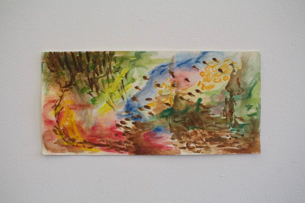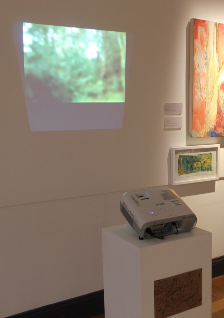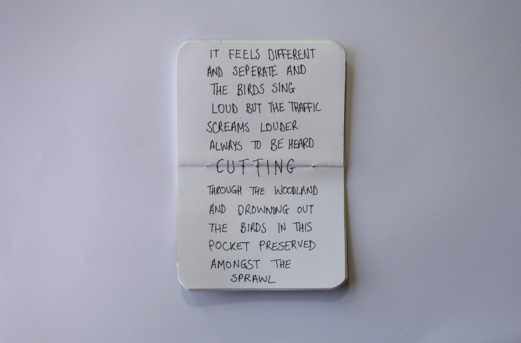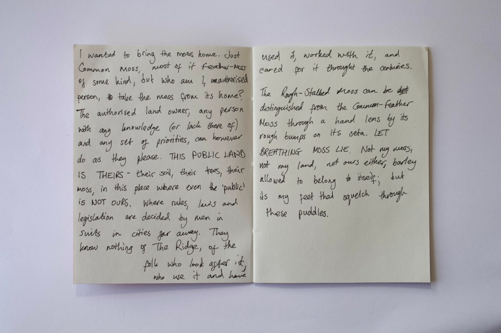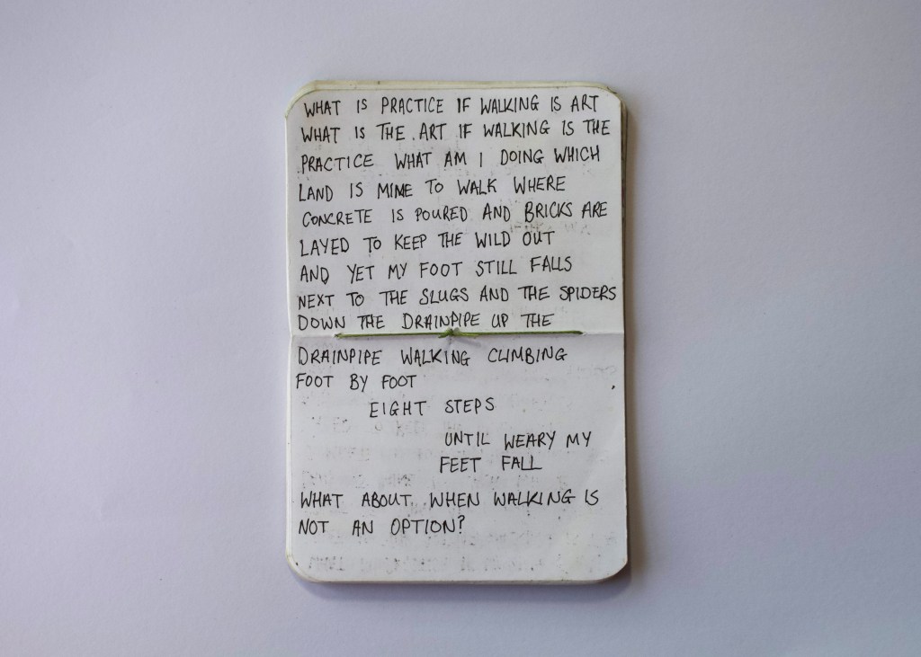Walking Woodhouse Ridge has been exhibited twice, in both iterations of I Never Agreed to Lend My Voice, with each iteration playing with curation and presentation of work. The first iteration in the Project Space, Leeds, sees the installation of lots of small works (seen below), along with two audio works at different heights (one capturing ambient sounds from walks on the Ridge, and one capturing bodily sounds), and a projection work.